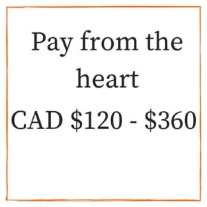 As for our part in this pay from the heart model: since we have expenses hosting the classes and we are investing significant amounts of volunteer (service) time and our combined experience in creating, teaching, and administrating the course, we are setting the minimum amount at $120 CAD. All proceeds will go to Clear Sky center.